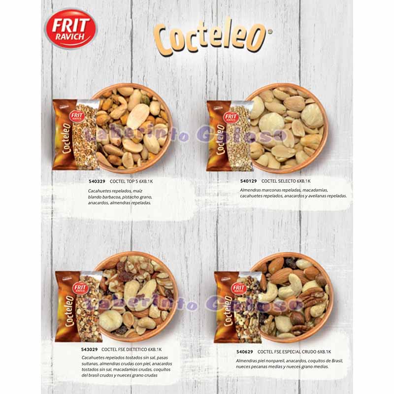 Cóctel Top 5 de Frit Ravich, en bolsa de 1 Kg. Es un delicioso cóctel de frutos secos con: Cacahuetes repelados, maíz blando barbacoa, pistacho grano, anacardos, almendras repeladas.