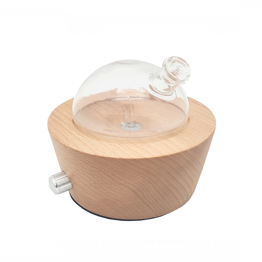 Difusor por nebulización INNO con un diseño minimalista con base de madera. Difunde los aceites esenciales sin calor preservando sus propiedades. Es muy silencioso y ofrece 2 intensidades de difusión,