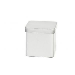Una pequeña caja metálica cuadrada con tapa suelta y cierre a presión sin reborde en tapa que la hace más elegante, de medidas 57 x 57 x 60 mm ideal para tés o infusiones a granel.