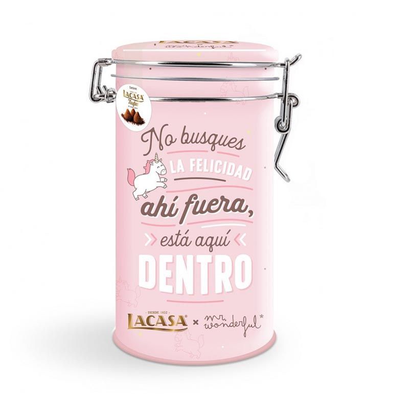 Alegre lata de Trufas Lacasa de color Rosa y Mr Wonderful con deliciosas trufas Lacasa al cacao puro en su interior (bolsitas de 100 g).. Si estás buscando un regalo para una persona especial. Elige Lacasa. Con estas latas de Mr. Wondeful y sus divertidos mensajes, su magnífica presentación y en su interior los deliciosas trufas el éxito está garantizado.