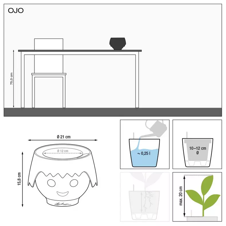 - Diseño interactivo: Con forma de personaje Playmobil, OJO presenta un diseño amigable que incluye ojos interactivos. Los ojos cambian de color para indicar si la planta necesita agua, facilitando el cuidado diario.