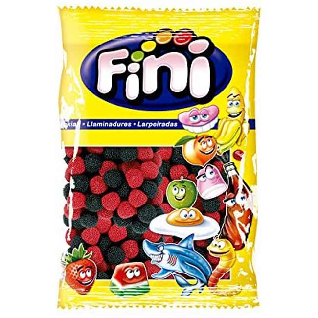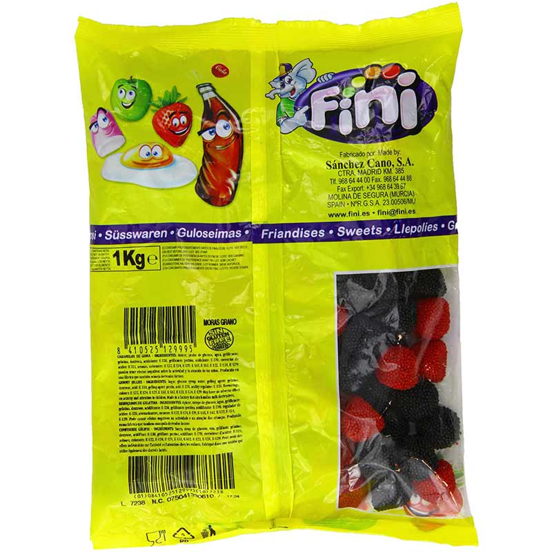 Deliciosas Gominolas Fini Moras Grano, con forma de moras y con sabor muy tierno. Bolsa de 1kg. Contiene unas 143 golosinas aproximadamente. Cada chuche tiene 7g. Producto sin gluten.