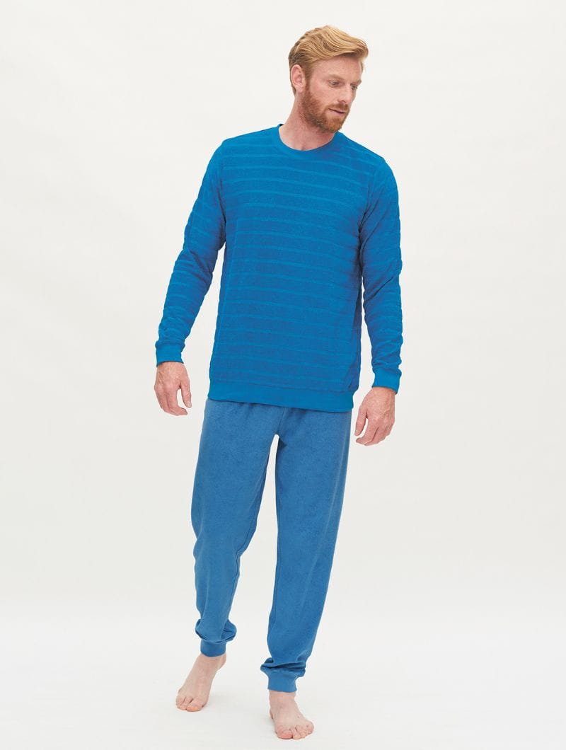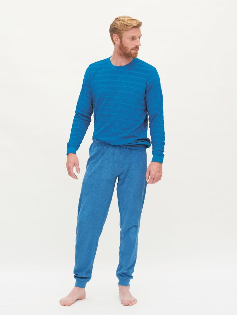 Sabemos lo importante que es sentirse bien durante la noche, por eso te ofrecemos un pijama con algodón orgánico que no solo te brindará una sensación cálida y acogedora en esas noches frescas, sino que también cuidará tu piel gracias a su tejido suave de rizo. Y no solo se trata de comodidad, su diseño regular complementado con puños anchos y un acabado elegante en el escote, le da ese toque informal que buscas en tu ropa de descanso.