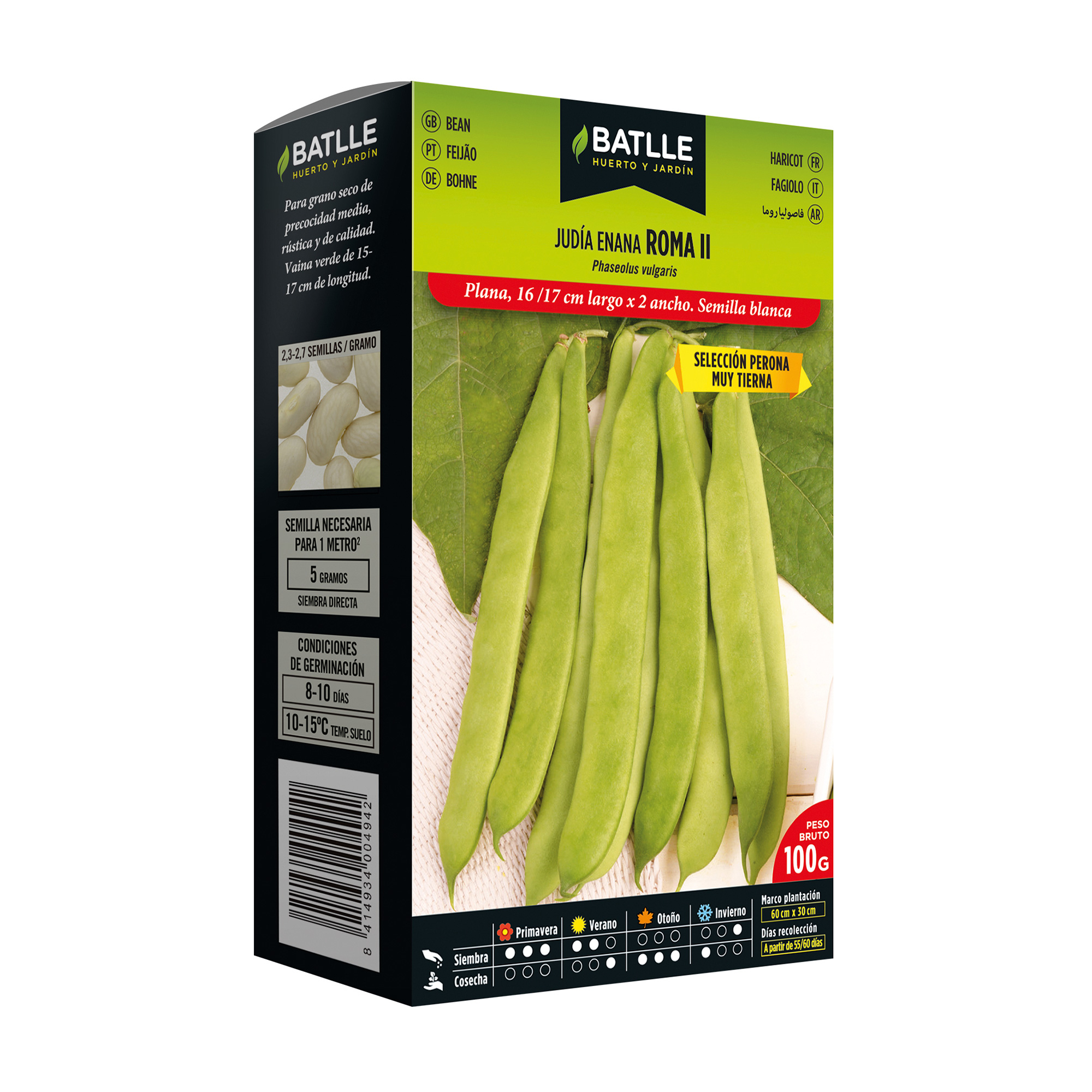 Semillas de Judía Enana Roma II Selección Perona de Batlle, variedad de vaina plana, verde y muy tierna, sin hilos. De crecimiento compacto, ideal para siembras en primavera y verano con cosecha rápida desde 45 días.