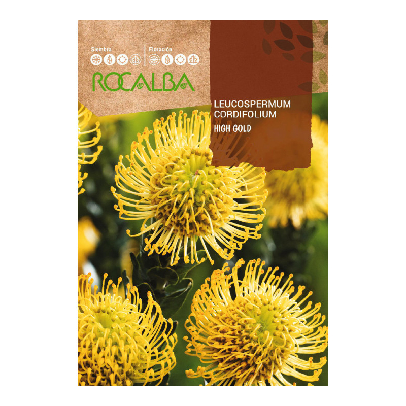 Semillas Protea Leucospermum Cordifolium «High Gold», también conocida como «Cabeza de Alfiler», es una planta perenne originaria de Sudáfrica. Destaca por sus espectaculares flores en tonos dorados, con una estructura esférica única que la convierte en una opción perfecta para jardines exóticos y flor cortada.