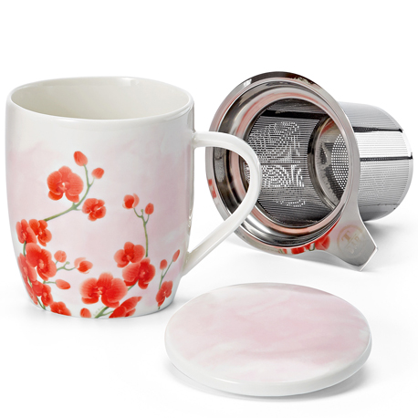 Preciosa taza de porcelana con filtro de acero inxidable y tapa para disfrutar de tu infusión. Ideal para regalar.